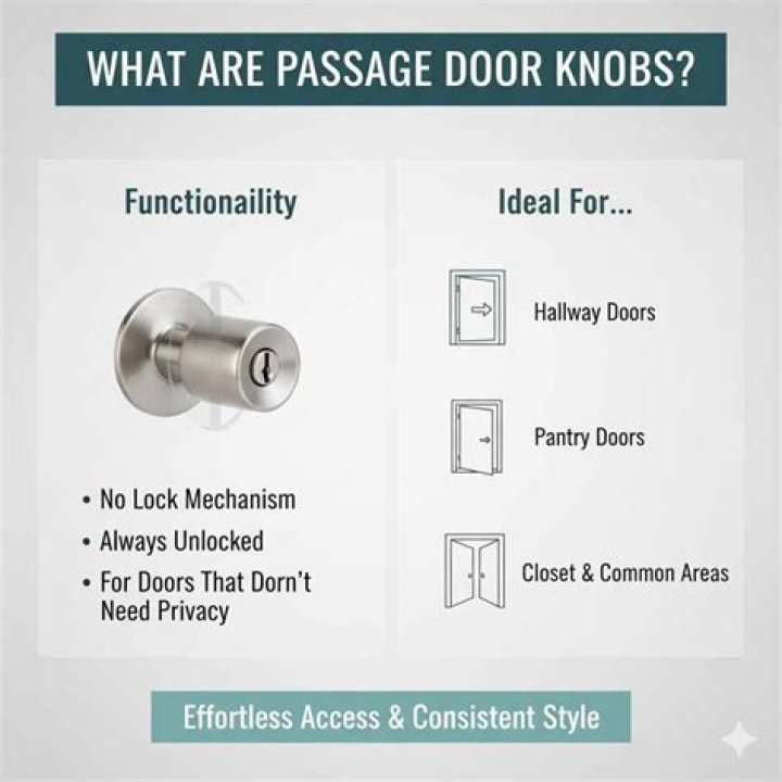 Passage door knobs are similar to dummy door knobs. They don’t lock but are used to open doors and go between rooms. Passage door knobs are ideal for interior hallways, closets and other rooms that don’t need privacy locks. They’re also called unkeyed knobs.