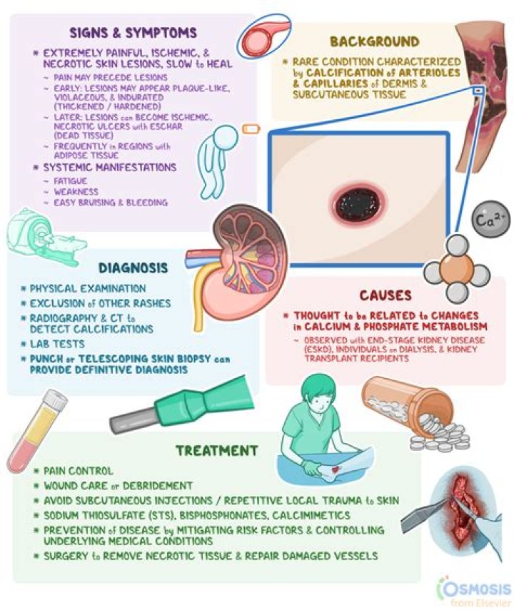 The use of hyperbaric oxygen therapy, vitamin K and wound debridement are examples of management strategies that been reported to improve wound healing and therefore may also improve pain. Sodium thiosulphate (STS) has been widely reported as a potential treatment for calciphylaxis.
