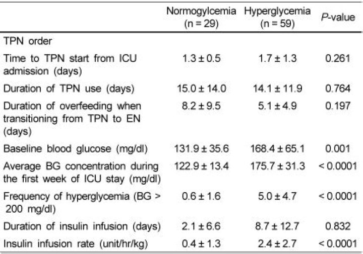 In conclusion, our study showed that the amount of dextrose delivered via TPN might be associated with the development of hyperglycemia and poor clinical outcomes in critically ill patients without a history of diabetes mellitus and should be adapted carefully to maintain blood glucose within the target range.Does TPN cause hypoglycemia?