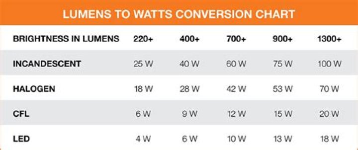 Lumens (Brightness)LED Watts (Viribright)CFL Watts400 – 5006 – 7W8 – 12W650 – 8507 – 10W13 – 18W1000 – 140012 – 13W18 – 22W1450-1700+14 – 20W23 – 30W