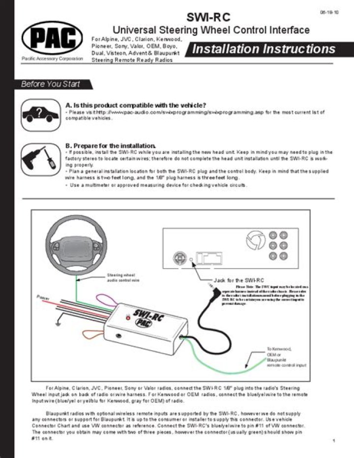 Take note that the steering wheel control jack for Pioneer radios is labeled “W/R”. For Sony radios it is a blue jack labeled “REMOTE”. • Any radio using a wire for SWC connection: Ensure the correct steering wheel control wire is used from the Female 3.5mm jack with stripped leads(included with ASWC-1).How do I reset my PAC SWI RC?