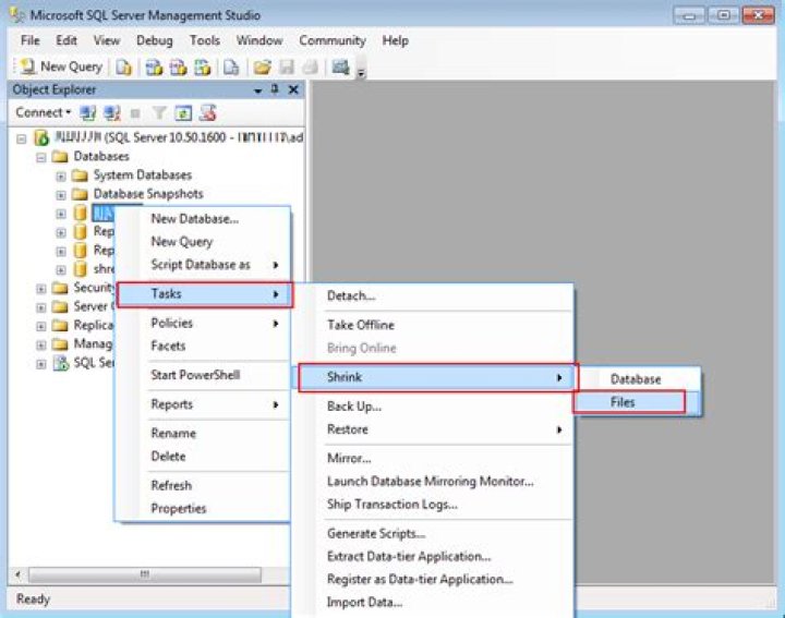 - Right-click the database again and select Tasks -> Shrink -> Files.