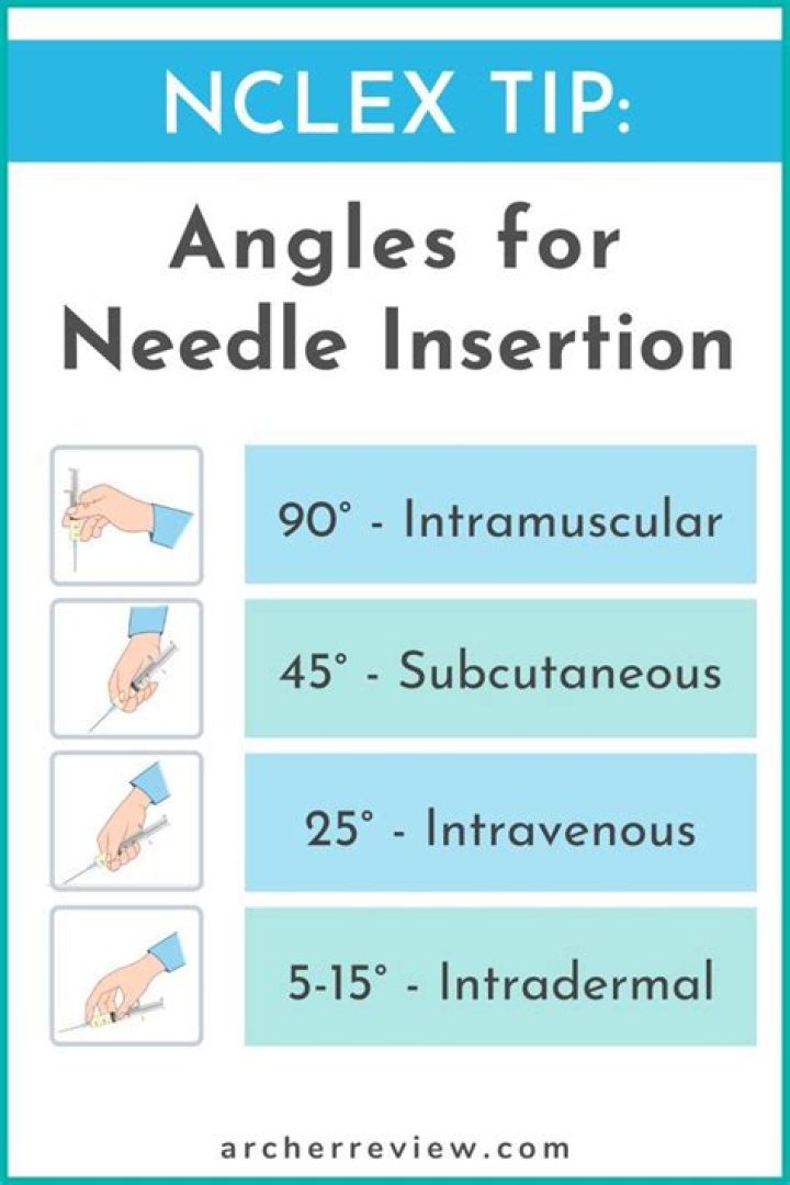 Insert the needle into your vein with the needle bevel (opening) facing up, at a 15 to 35 degree angle, and always in the direction of the heart. The more perpendicular the needle is to the injection site, the greater chance you have of sticking the needle through the vein instead of into it.