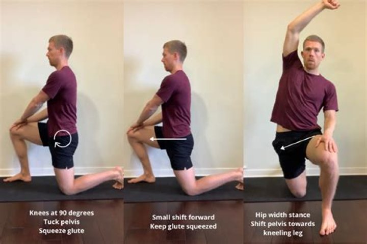 - Keeping your back straight, slowly push your hips forward until you feel a stretch in the upper thigh of your back leg and hip.