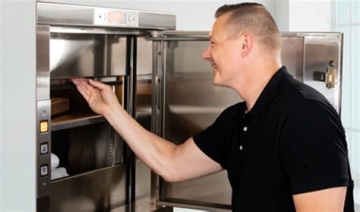 A dumbwaiter is a small freight elevator or lift intended to carry food. … When installed in restaurants, schools, hospitals, retirement homes or in private homes, the lifts generally terminate in a kitchen.