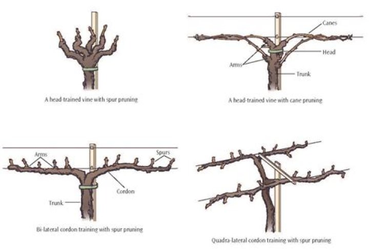 Select a sturdy cane and cut this back 3 to 4 feet (1 m.), leaving at least a two-bud renewal spur. This cane should be tied to a wire support or trellis. Be sure to remove all other canes. As the vine completes each growing season, you’ll cut off the old trunk just below the renewal cane.