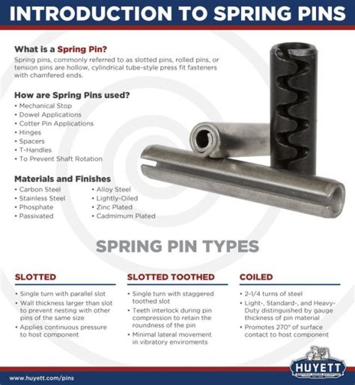 Spring pins are made from a thin sheet of material curved around to form the outer diameter of the pin. They’re typically formed from sheet steel and have a chamfer at each end, enabling them to be easily pushed into the hole.What is a coiled spring pin?