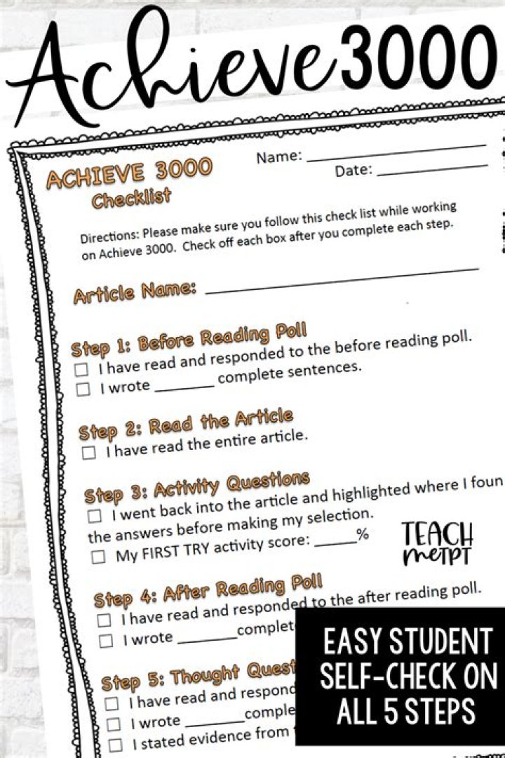 Achieve3000® provides lessons that follow a five- step routine: (1) respond to a Before Reading Poll, (2) read an article, (3) answer activity questions, (4) respond to an After Reading Poll, and (5) answer a Thought Question.