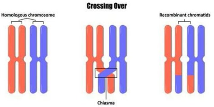 During meiosis, homologous chromosomes (1 from each parent) pair along their lengths. The chromosomes cross over at points called chiasma. At each chiasma, the chromosomes break and rejoin, trading some of their genes. This recombination results in genetic variation.