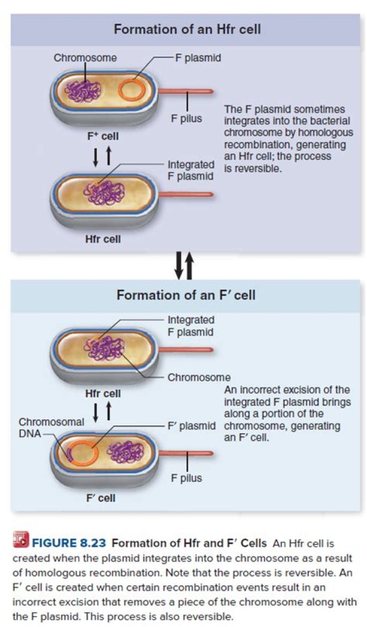Hfr cells (high frequency recombination) have the F plasmid incorporated INTO THE CHROMOSOME! … Crossing over takes place between F factor and chromosome. Bacterial genes may be transferred from an Hfr cell to an F- cell in conjugation. In conjugation, F is nicked and the 5′ end moves into the 5- cell.