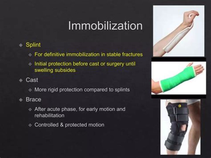 Immobilization restricts motion to allow the injured area to heal. It can help reduce pain , swelling, and muscle spasms . In some cases, splints and casts are applied after surgical procedures that repair bones, tendons, or ligaments. This allows for protection and proper alignment early in the healing process.