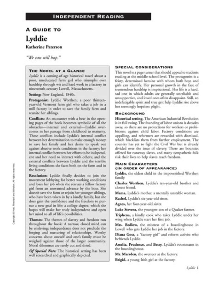 It follows the main character, Lyddie Worthen, as she works to save her family and their farm. By the end of the novel, Lyddie has changed and has gained freedom to make her own life decisions.How old is Luke in Lyddie?