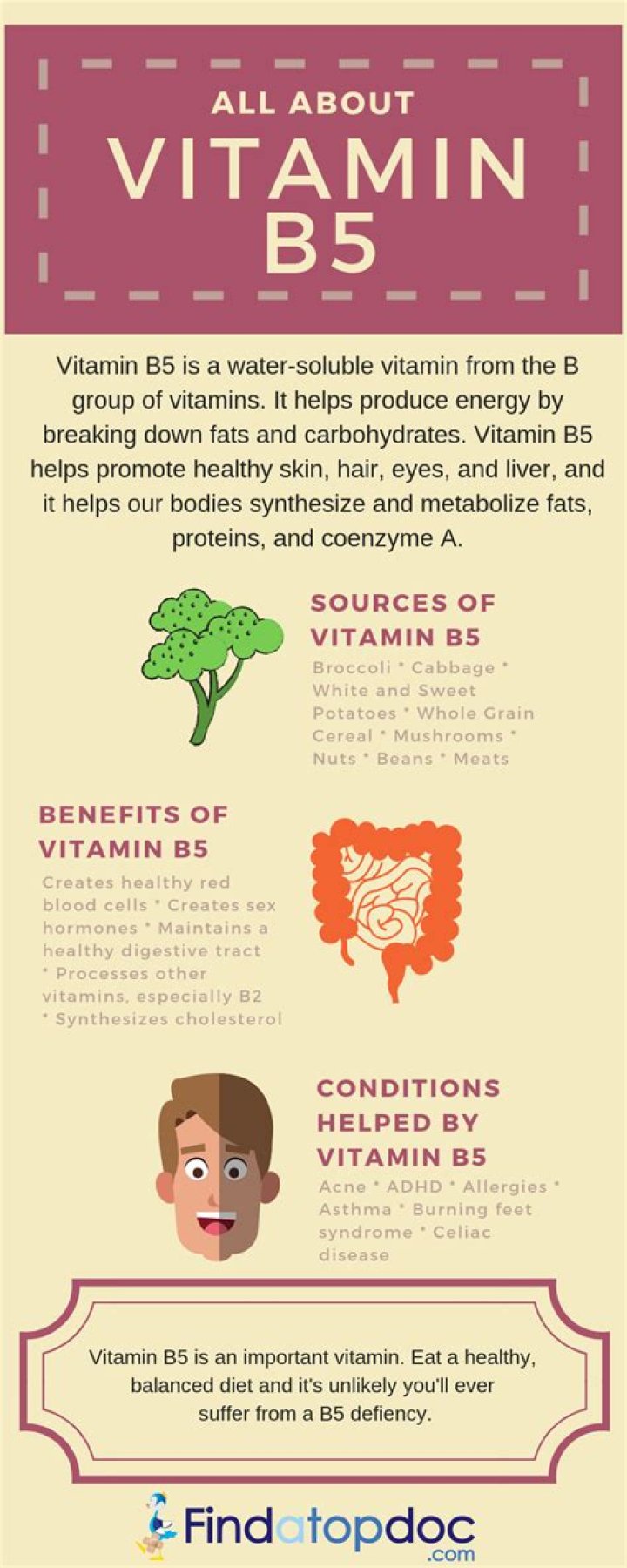Found in a variety of food sources, Vitamin B5, or pantothenic acid, is a water-soluble essential nutrient. … Stable to use and easily absorbed, once it penetrates the skin it quickly converts into – you guessed it – Vitamin B5.What happens if you take too much vitamin B5?