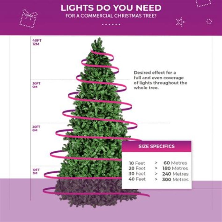 We recommend as a guide you use approx 30 lights per foot in height of your Christmas Tree. For example, a 4ft. Christmas tree should have 120 Christmas tree lights, 5ft. tree 150 lights, 6ft tree 180 lights and a 7ft tree 210 lights.