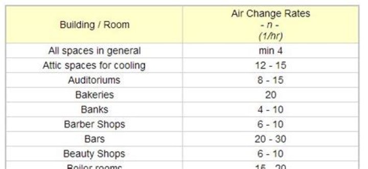Derives the ventilation rate from the volume of the space (in cubic feet) to be ventilated multiplied by the number of total air changes in one hour. Example: For an auditorium, the suggested air change rate is 4 to 15 air changes per hour. An auditorium is 80′ x 90 ‘ with 20’ ceiling or 144,000 cu. ft.