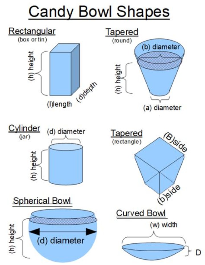 An approximate method to calculate the number of sweets in a jar, is to multiply the number along the width and length of the base by the number of sweets in the height of the jar. Granular Matter theory then tells us that on average a jar of mixed shapes will have about a 30% air gap in between the sweets.How do I calculate the size of a jar?