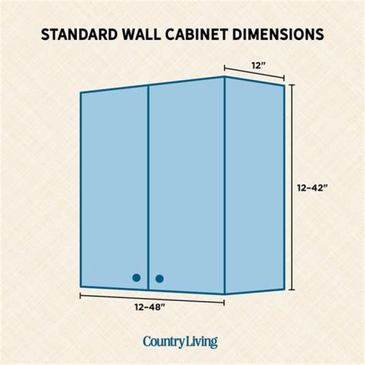 Standard kitchen cabinet heights include 12, 15, 18, 30, 36 and 42 inches tall; depth ranges from 12 to 18 inches. Typically installed 18 inches above countertops, 54 inches above floor and 24 inches above stove.
