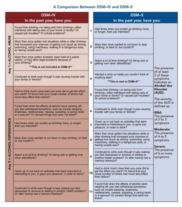 DSM–5 integrates the two DSM–IV disorders, alcohol abuse and alcohol dependence, into a single disorder called alcohol use disorder (AUD) with mild, moderate, and severe sub-classifications.