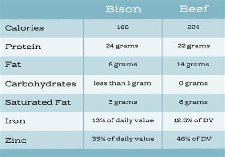 Bison is leaner than beef and may be a healthier choice if you’re looking to reduce your calorie or fat intake. It has nearly 25% fewer calories than beef and is lower in total and saturated fat ( 2 , 3 ). Additionally, due to its lower fat content, bison has finer fat marbling, yielding softer and more tender meat.