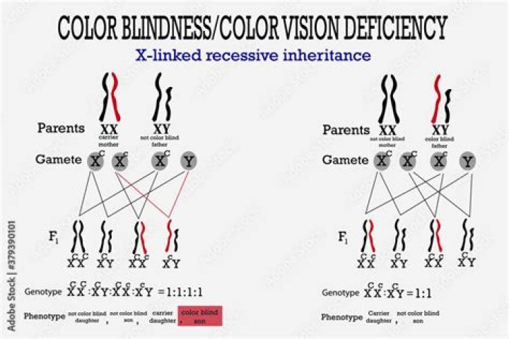 Most commonly, color blindness is inherited as a recessive trait on the X chromosome. This is known in genetics as X-linked recessive inheritance. As a result, the condition tends to affect males more often than females (8% male, 0.5% female).
