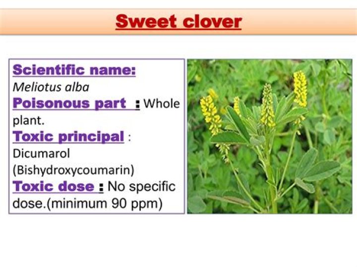 Sweet clover contains a high level of a chemical that can be converted to an anticoagulant. Improperly curing hay made from certain sweet clover varieties such as white and yellow sweet clover can cause severe and often fatal hemorrhages in livestock such as cattle, sheep and goats.