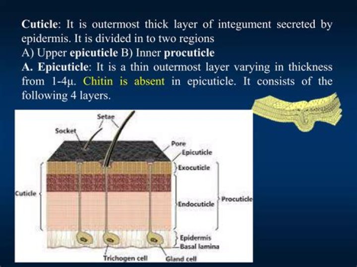 The cuticle is a layer of fat-soluble substances and of derivatives of such substances lying uninterruptedly over the outer epidermal wall of the herbaceous shoot in angiosperms. Whilst the inner layers of the wall have a cellulose base, no cellulose is present in the cuticle.