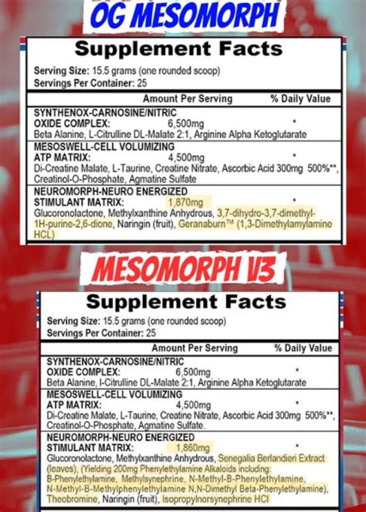 The combination of the other ingredients in Mesomorph along with the 1,3 DMAA made this supplement a #1 hit in the fitness and nutrition industry. … The version also had a blend of muscle building ingredients that were not being used in other pre-workout supplements at the time.
