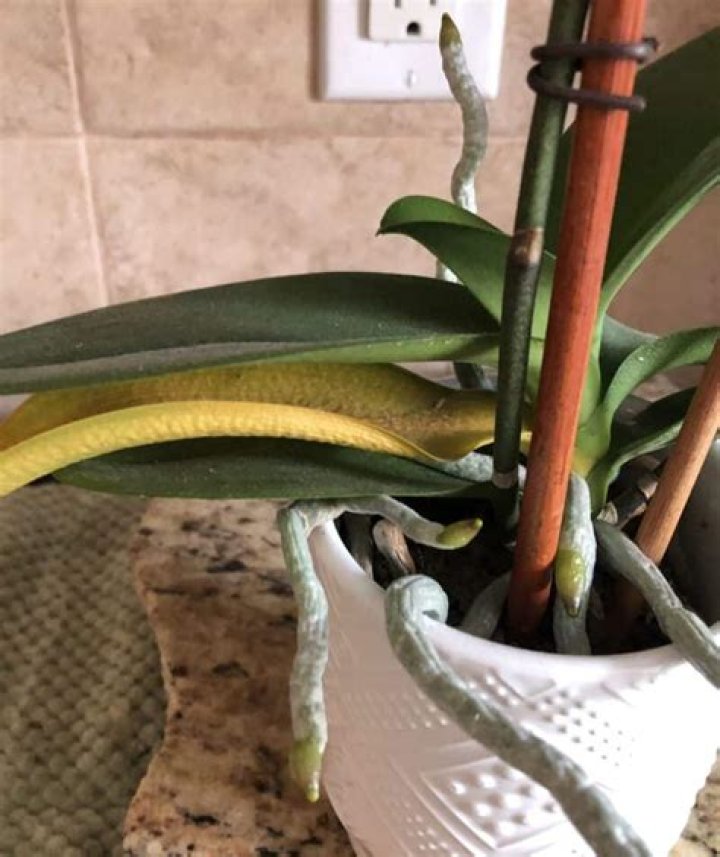 Overwatering Can Lead to Yellowing Leaves Overwatering your orchid can lead to root rot, which can, in turn, cause its leaves to turn yellow. If your orchid is suffering from root rot, repotting in fresh new potting media will set the plant on the path to recovery.