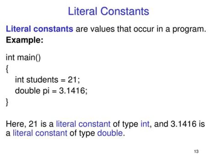 An example of a literal constant is a number like 5 , 1.23 , or a string like ‘This is a string’ or “It’s a string!” . It is called a literal because it is literal – you use its value literally. The number 2 always represents itself and nothing else – it is a constant because its value cannot be changed.What is a literal constant in Java?
