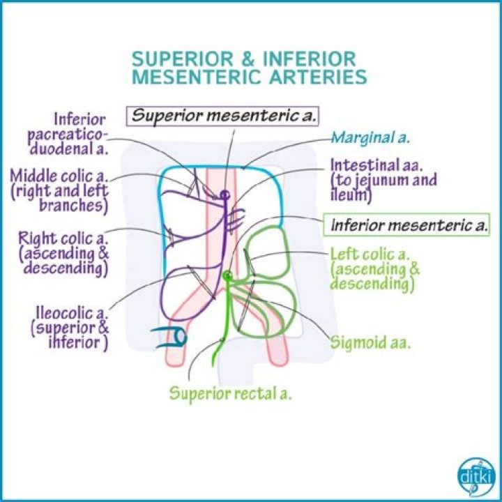 Superior mesenteric arteryBranchesinferior pancreaticoduodenal middle colic right colic intestinal branches (jejunal, ileal) ileocolicVeinsuperior mesenteric veinSuppliesintestineIdentifiers
