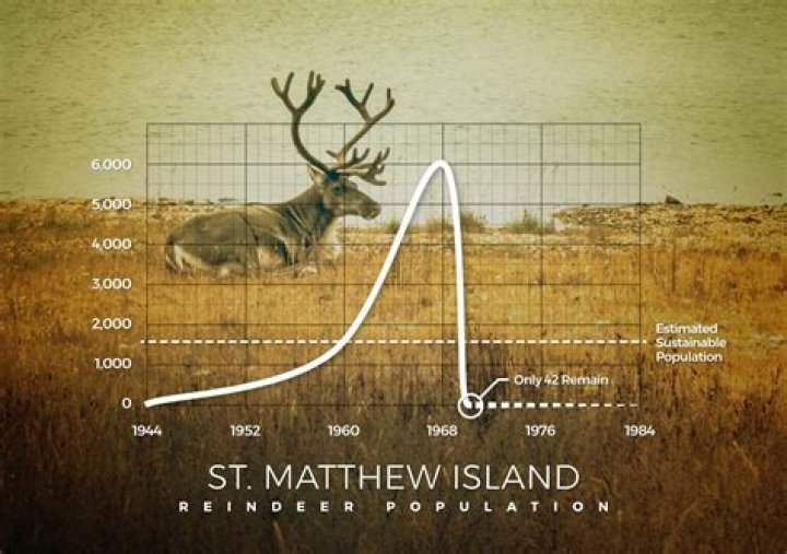 Reindeer introduced to St. Matthew Island in 1944 increased from 29 animals at that time to 6,000 in the summer of 1963, a drastic overshoot of the island’s carrying capacity causing a crash die-off the following winter to 42 animals.