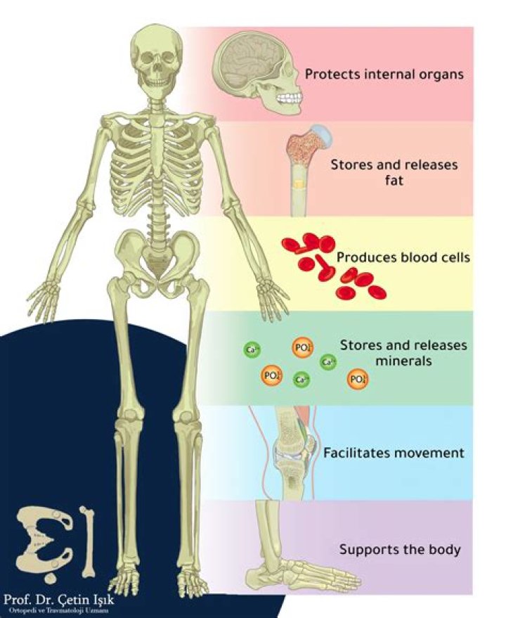 The skeleton has four main functions: to protect some of the vital organs of the body. to help the body move. to make blood cells.
