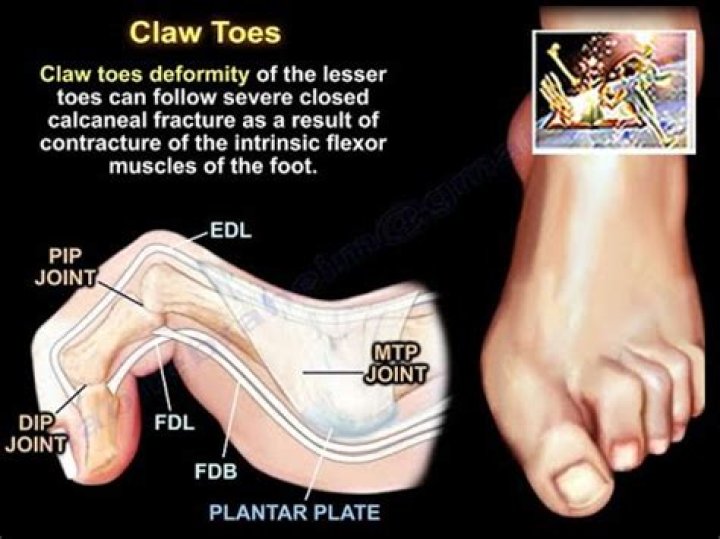 Claw foot is a deformity of the foot. The joint of the toe that is closest to the ankle is bent upward, and the other joints are bent downward. The toe looks like a claw.