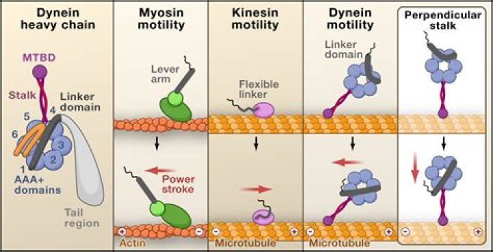 Cells from human, animals and fungi all have three different types of motor proteins that scientists refer to as myosin, kinesin and dynein. Kinesin and dynein move on the same cytoskeleton track and normally in opposite directions. … Land plants do not have dynein. But they have many kinesin-14 motors, said Qiu.
