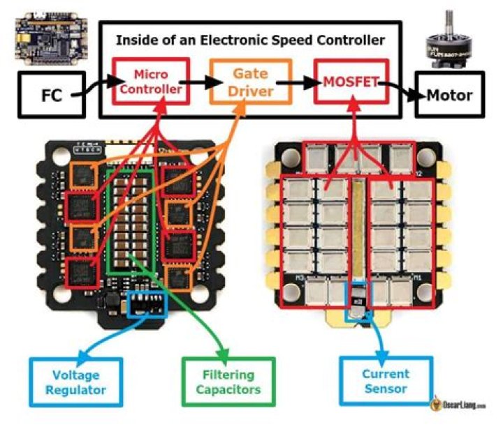 Due to the differences in motor technology, different ESCs are required for drones with brushed motors and those with brushless motors. Multirotor drones may have an ESC for each rotor, or an integrated device that handles all the rotors with one system.