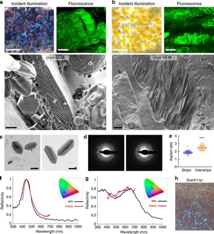 According to a new study by researchers at the University of Geneva, in Switzerland, the cells get their reflective abilities via tiny embedded crystals called guanine nanocrystals. … Conversely, when they’re moved slightly farther apart, the cells reflect longer wavelength colors like yellow, orange or red.