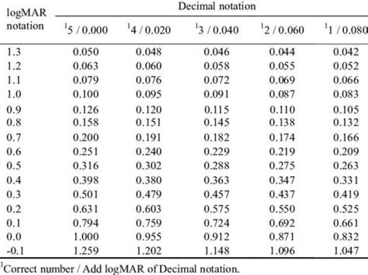 The logMAR scale is calculated as log (MAR) = log (1/V) = – log (V). LogMAR notation is widely used in scientific publications. Note that it is a scale of vision loss, since higher values indicate poorer vision. The value “0” indicates “no loss”, that is visual acuity equal to the reference standard (1.0, 20/20).