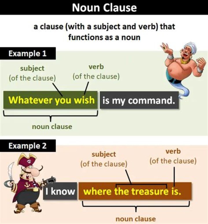 A noun clause functions as a noun in a sentence. It follows a linking or copular verb to describe or modify the subject of the sentence. Unlike noun phrases, noun clauses contain both a subject and a verb. Noun clause examples include: Do you know what time it is?
