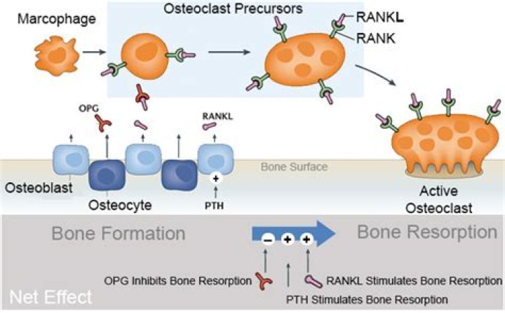 Parathyroid hormone (PTH) stimulates osteoclast formation by binding to its receptor on stromal/osteoblastic cells and stimulating the production of receptor activator of NFkappaB ligand (RANKL) and inhibiting the expression of osteoprotegerin (OPG).