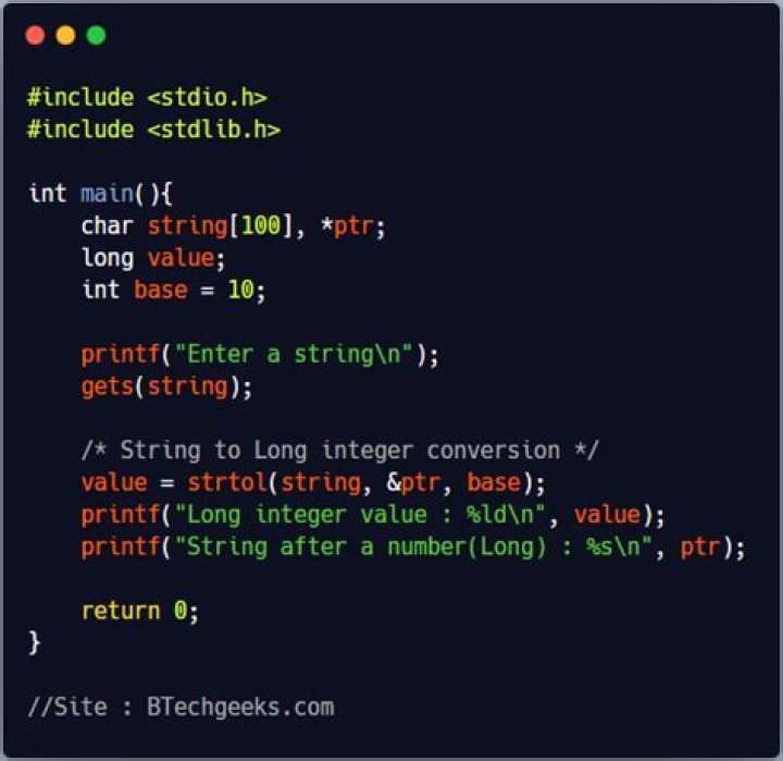In the C Programming Language, the strtol function converts a string to a long integer. The strtol function skips all white-space characters at the beginning of the string, converts the subsequent characters as part of the number, and then stops when it encounters the first character that isn’t a number.