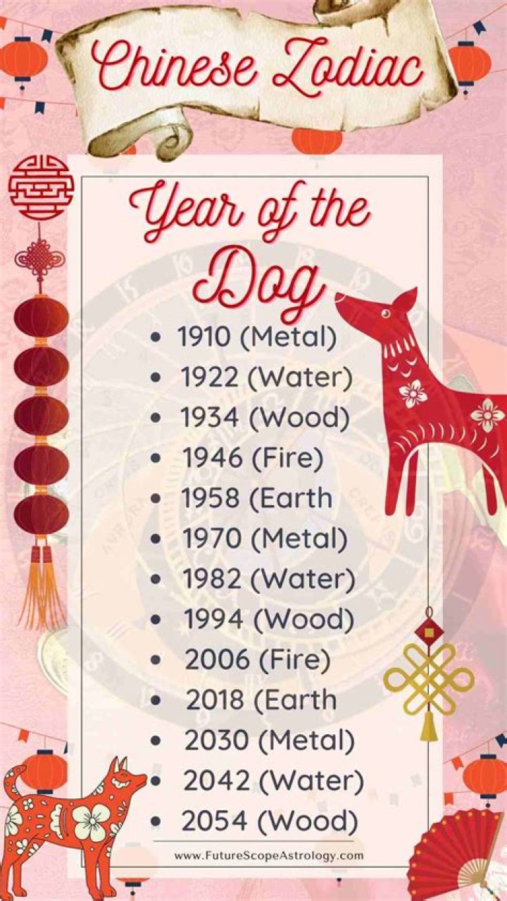 The recent Years of the Dog include 1922, 1934, 1946, 1958, 1970, 1982, 1994, 2006, 2018, 2030, 2042… Dog is men’s good friend who can understand the human spirit and obey its master, whether he is wealthy or not. … If a dog happens to come to a house, it symbolizes the coming of fortune.