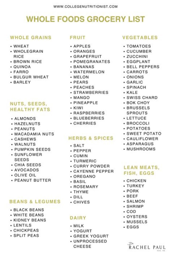 Whole foods include fruits, vegetables, legumes, nuts, seeds, whole grains, meat, fish and eggs. Think of food that you look at and recognize as something that exists in nature, like broccoli, a fish or a potato.