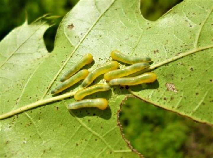 Oak worms are smooth, small, yellow-green caterpillars with brown heads and dark stripes down their sides. … Look for signs of leaf feeding or fecal pellets around the base of the tree for activity or worms raining down on you.