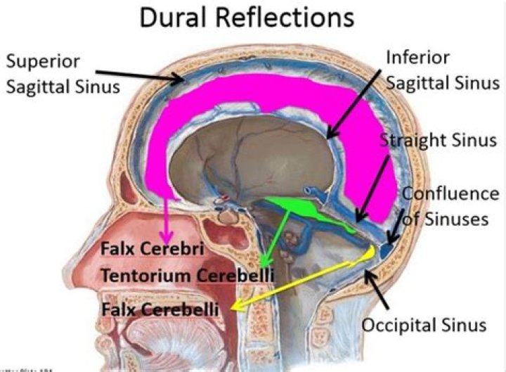 Dural reflections refer to places where two face-to-face meningeal layers descend into the cranial cavity to form the septa that compartmentalize the brain. The two main dural reflections are the falx cerebri and the tentorium cerebelli.