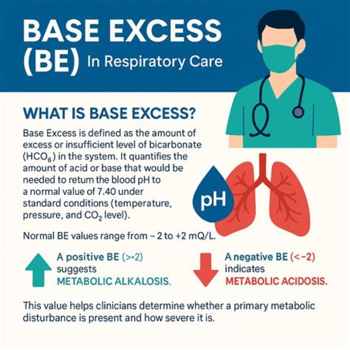 Base excess (BE) reflects the concentration of buffer. Normal range is 0 +/- 2 mEq/liter of base. Positive values express an excess of base or a deficit of acid; negative values express a deficit of base or an excess of acid. When the base excess is negative, it is sometimes referred to as the base deficit.