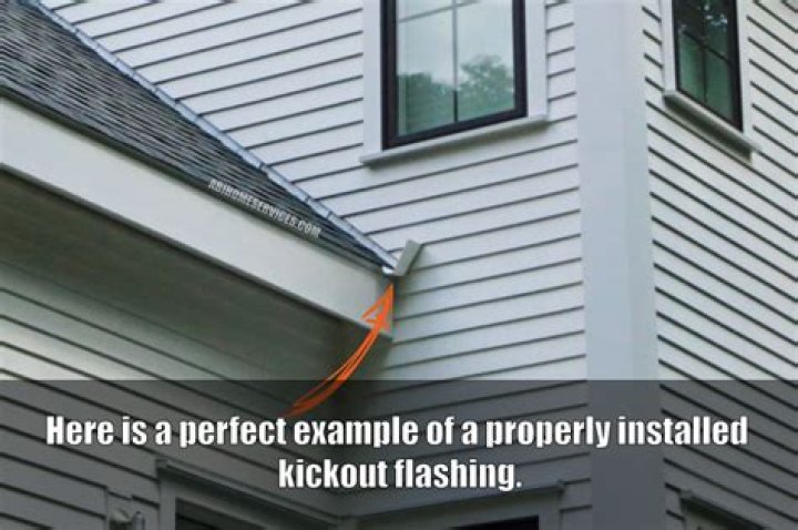 Kick-out flashing should be installed at the end of a roof-wall intersection to divert water away from the wall and into gutters. The kick-out flashing should be large enough to handle expected stormwater flows.