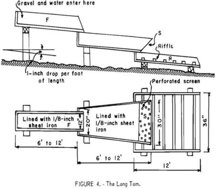 The long tom is a small sluice that uses less water than a regular sluice. It consists of a sloping trough 12 feet long, 15 to 20 inches wide at the upper end, flaring to 24 to 30 inches at the lower end. … The long tom uses much less water than a sluice but requires more labor.