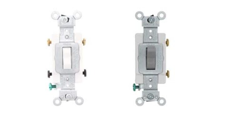A single pole switch has two brass terminals and a ground screw.