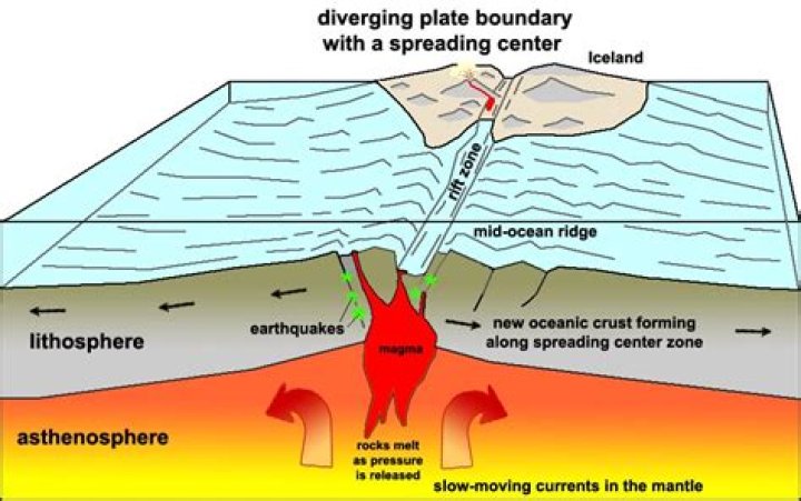 Divergent boundaries occur along spreading centers where plates are moving apart and new crust is created by magma pushing up from the mantle.Why do volcanoes form at spreading centers?