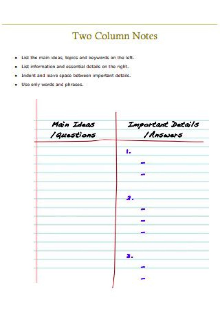 The Cornell Method is a 5-step method of taking notes in a condensed, organized, easy-to-study format. A sheet of paper is divided into 2 columns. The right side is about 2/3 of the page width, and the left side is about 1/3. These two columns take up about the top ¾ of the page.What is a two column chart?